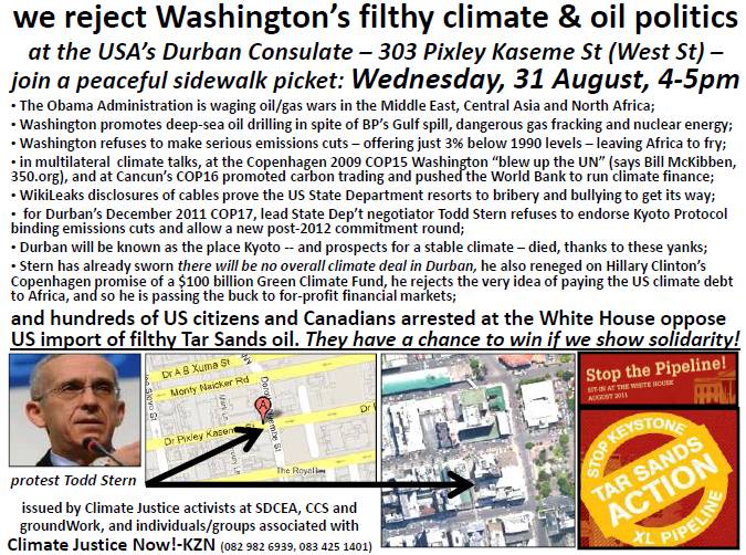 DURBAN, 1 December 2011 - Canada, you were once considered a leader on global issues like human rights and environmental protection. Today you're home to polluting tar sands oil, speeding the dangerous effects of climate change. For us in Africa, climate change is a life and death issue.