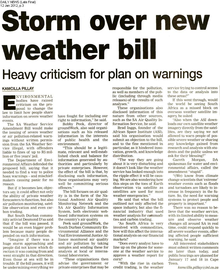 Thursday, 12 January 2012 - Amendments to the South African Weather Services Act, 2001 ("the Act"), proposed by means of the South African Weather Service Amendment Bill, 2011 ("the Bill"), make it a criminal offence if community people or academics report on air pollution events in South Africa. See submission by groundWork, the South Durban Community Environmental Alliance and the Vaal Environmental Justice Alliance to the Portfolio Committee on Water and Environmental Affairs, prepared by the Centre for Environmental Rights.