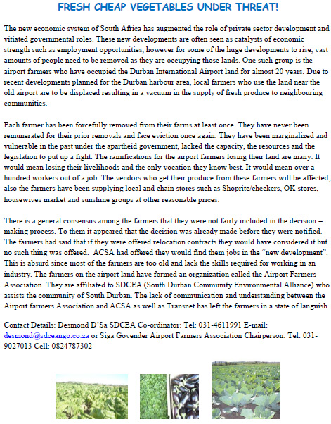 Durban harbour expansion to push farmers off land – communities to lose cheap produce source.